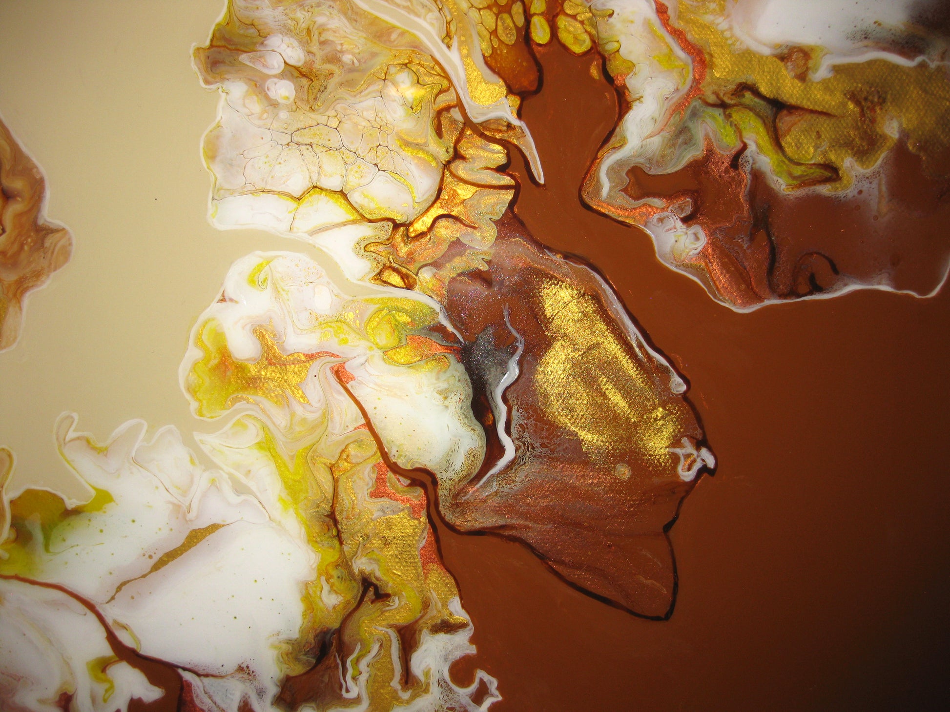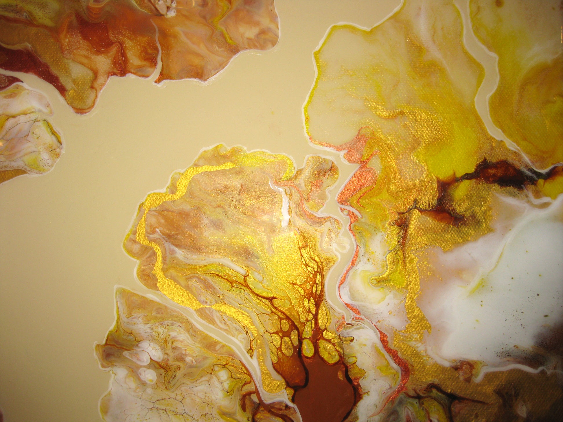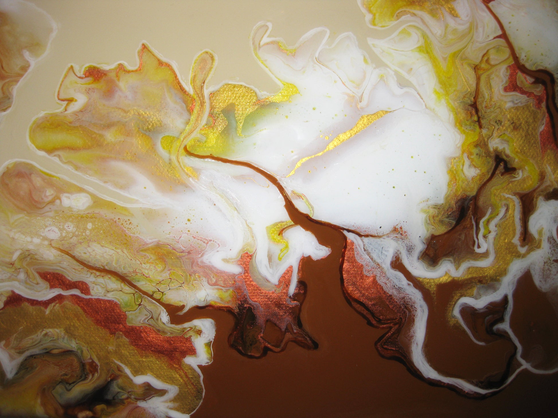 For this unique and beautiful creation, I used Unbleached titanium, burnt umber and raw sienna as a background then added various shades of copper, gold, metallic yellow and white using a blowout technique. It was then sealed with resin to enhance the color.