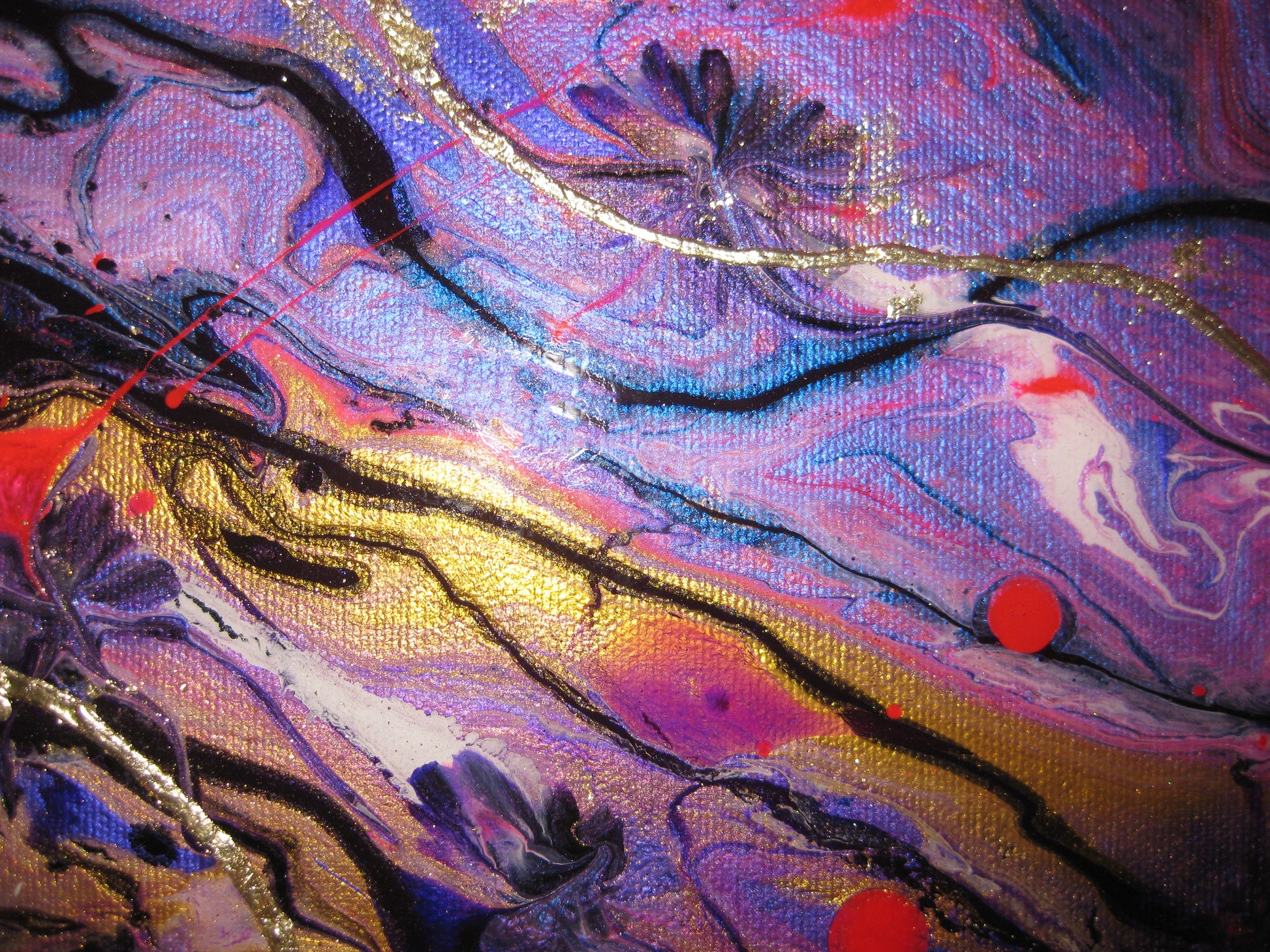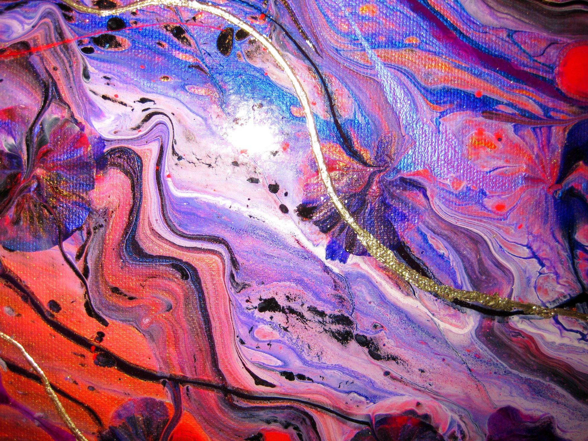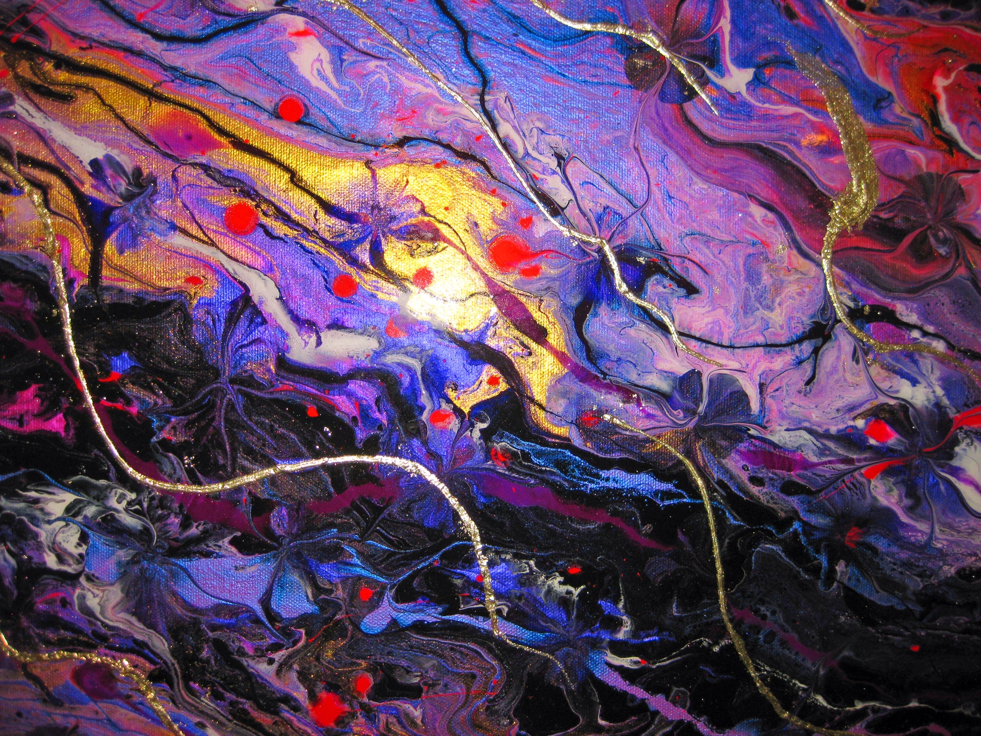 On this dark but vibrant painting I used a black canvas with black, various shades of purple, neon pink , gold and white paints in an open cup pour technique. I then Highlighted the painting with ribbons of gold leaf and sealed it with resin.