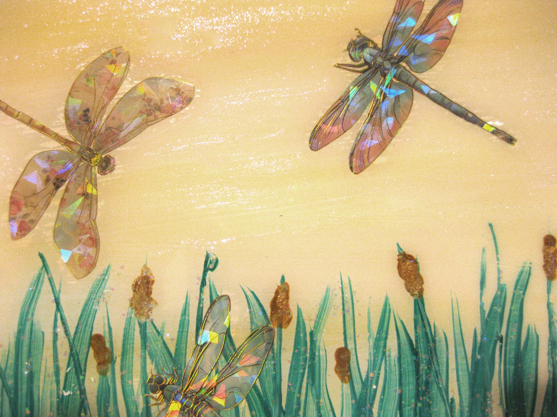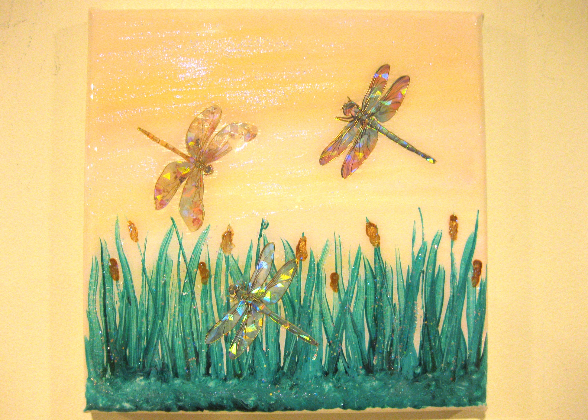 This beautiful petite painting was one of four in a series was painted with colours of yellow, white, greens and brown, reflecting dragonflies flying around cattails. The dragonflies were appliqued onto the painting, then sealed with dragonfly glaze infused resin to add sparkle.