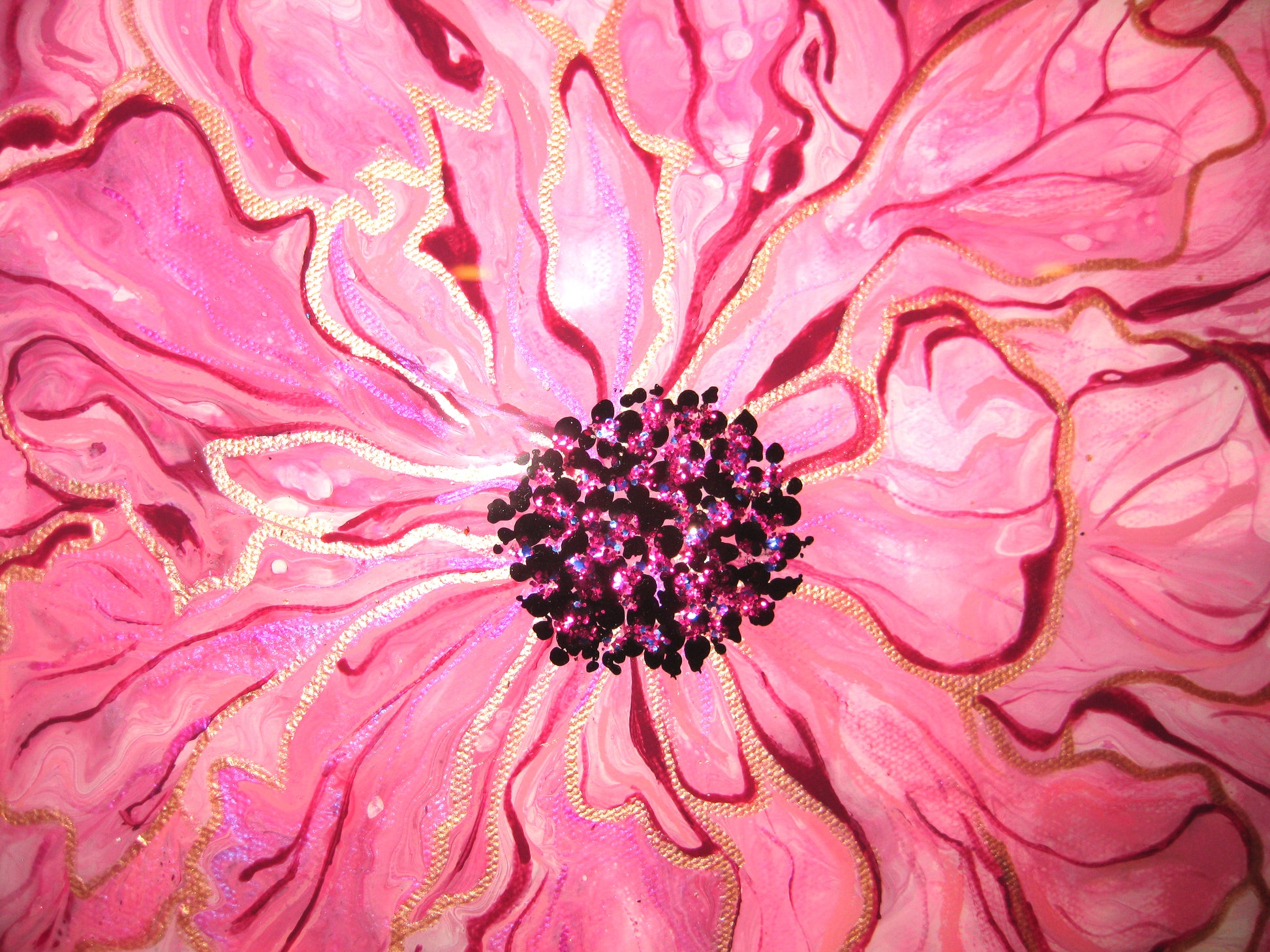 This one of a kind painting was created on a Rose pink leaf and white background. I added various shades of pink, magenta and gold in a center blowout technique and highlighted it with gold, and added berry glitter paint to accent the center. It was then sealed with resin to enhance all the colors.