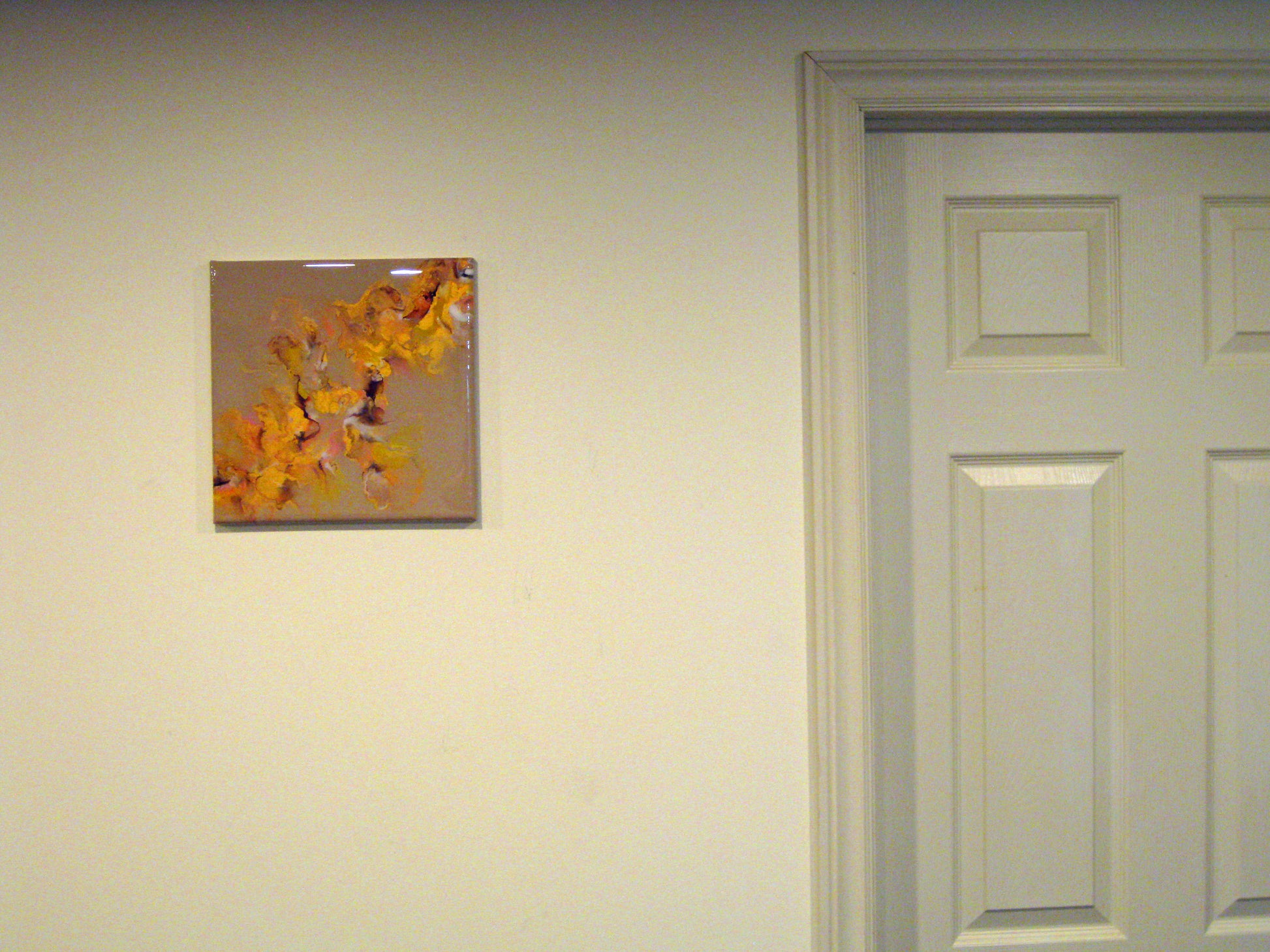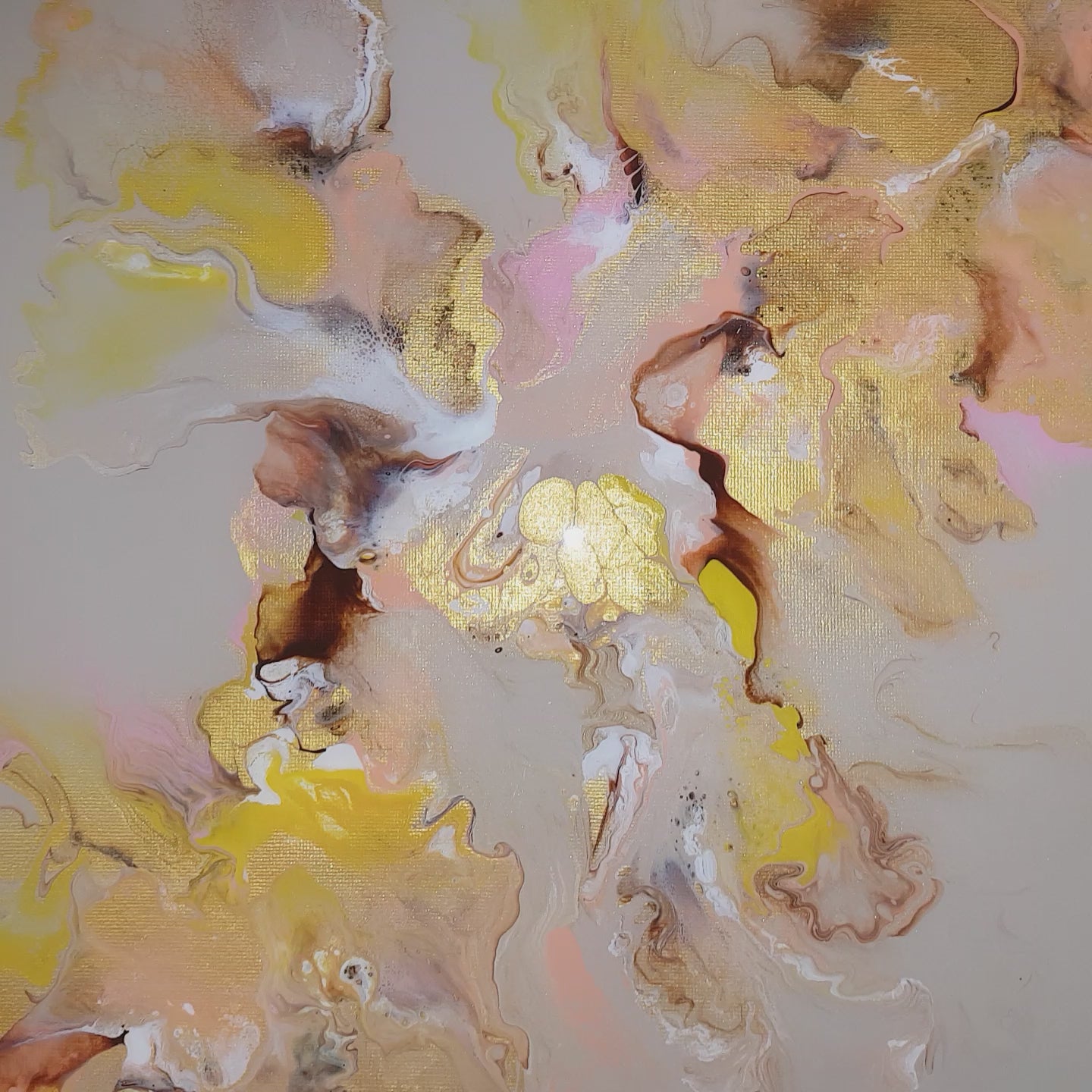 This pretty little creation was done on a warm grey background. I used gold, light pink, peach, white and burnt umber using a blowout technique and sealed it with resin to enhance its colors.