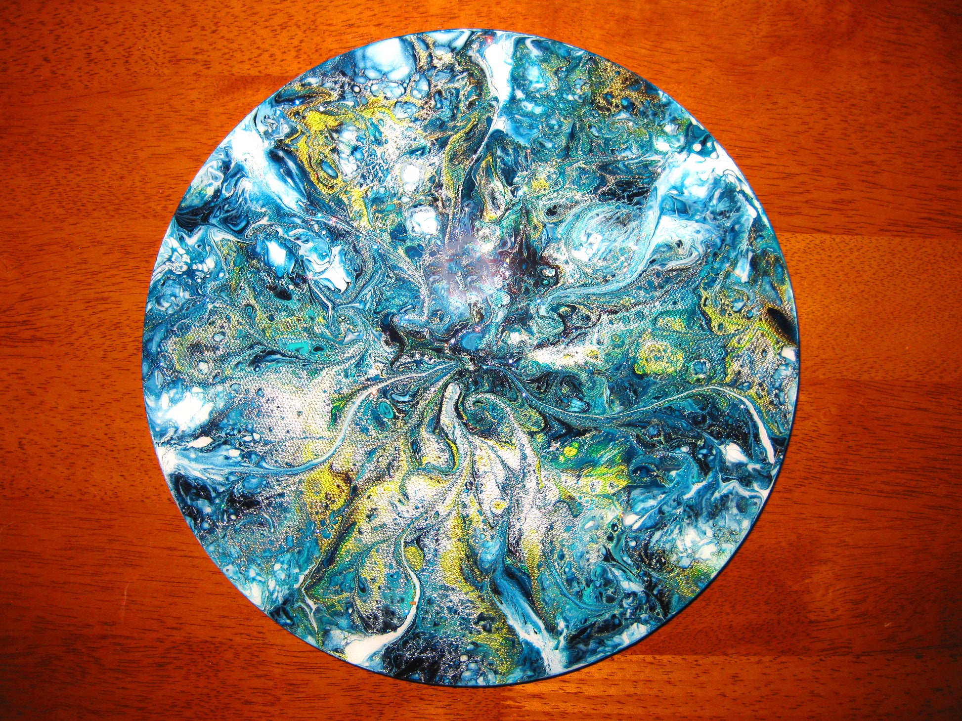 This small unique piece was done on a round canvas. I added white, silver, blues, turquois and iridescent green/yellow and used a spin-out technic. I then highlighted it with silver glitter paint and sealed it with resin to enhance the glitter and shine.