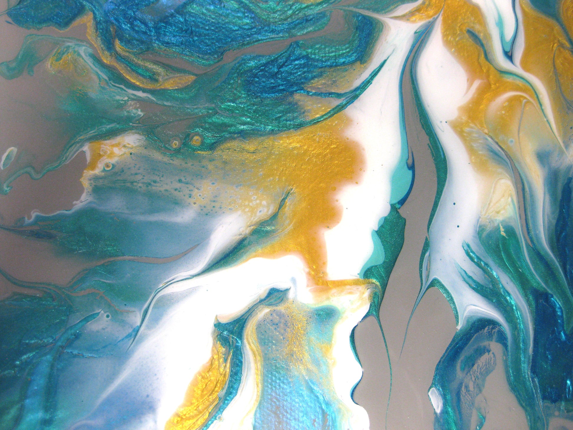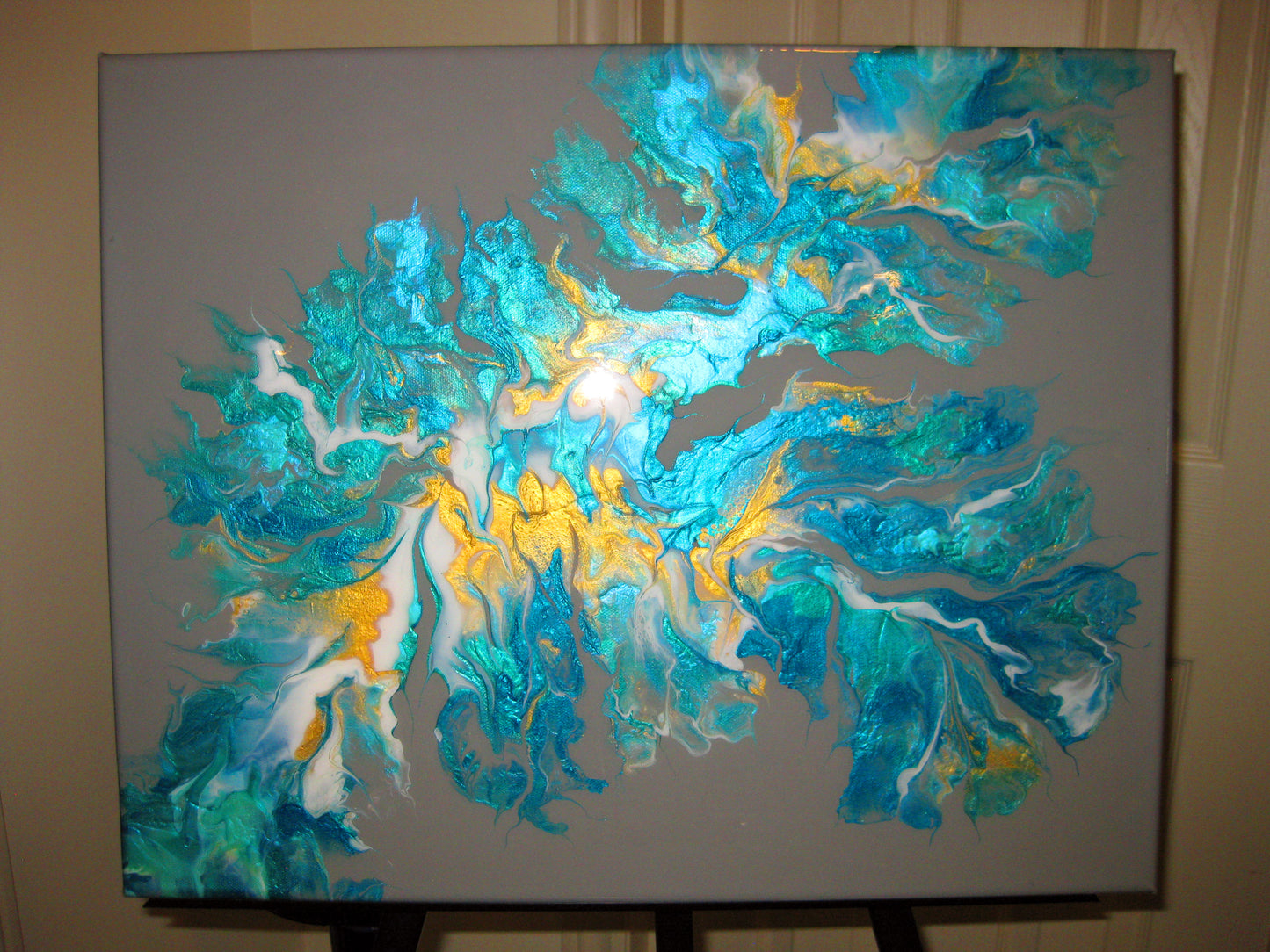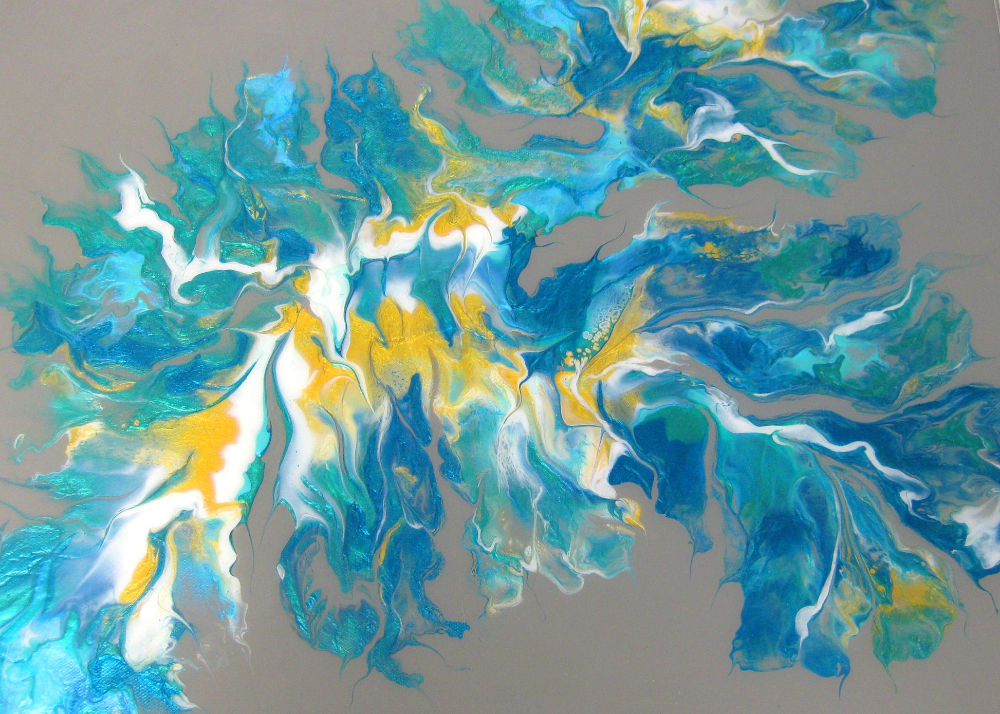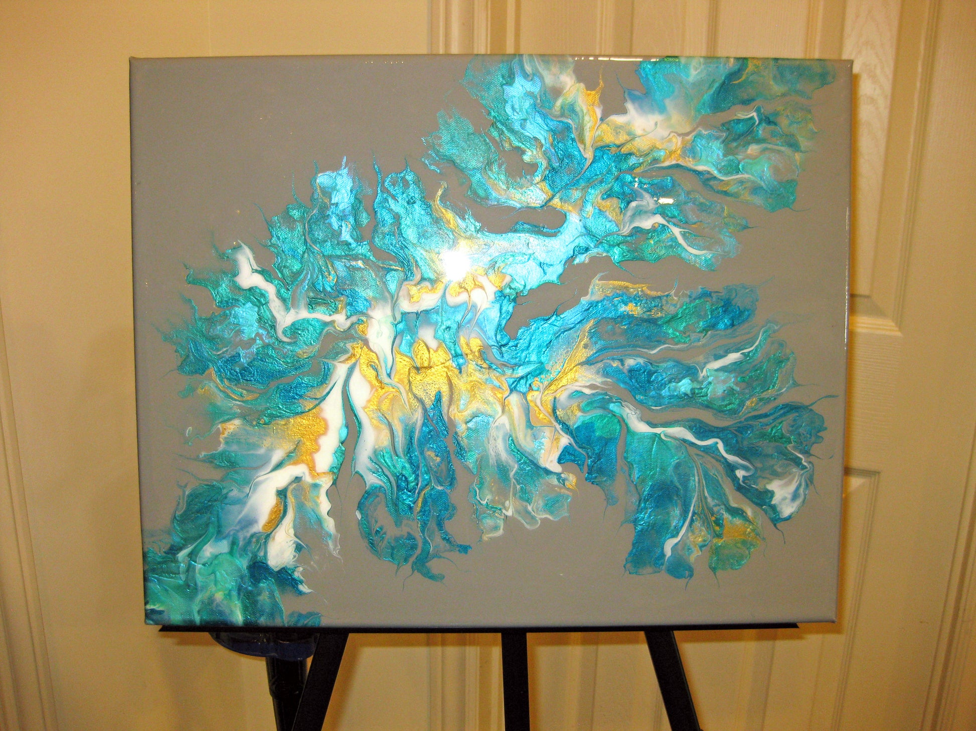 This striking abstract was created on a grey background using white, gold , pearlized turquois, pearlized green and iridescent fluorescent green. I used a blowout technic and then sealed it with resin to enhance its beauty.