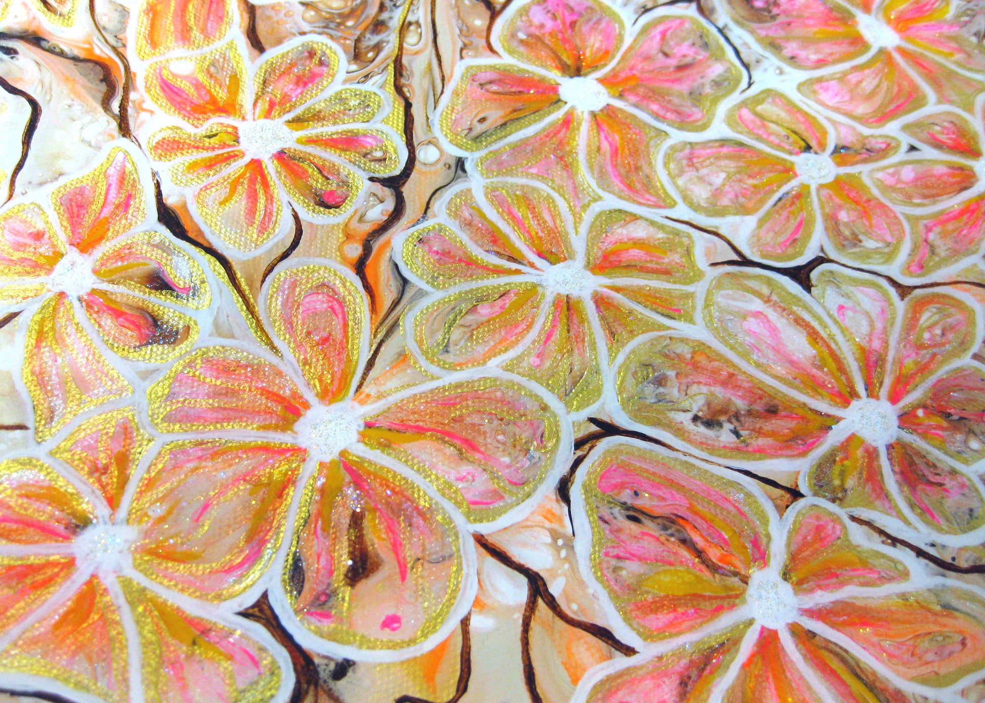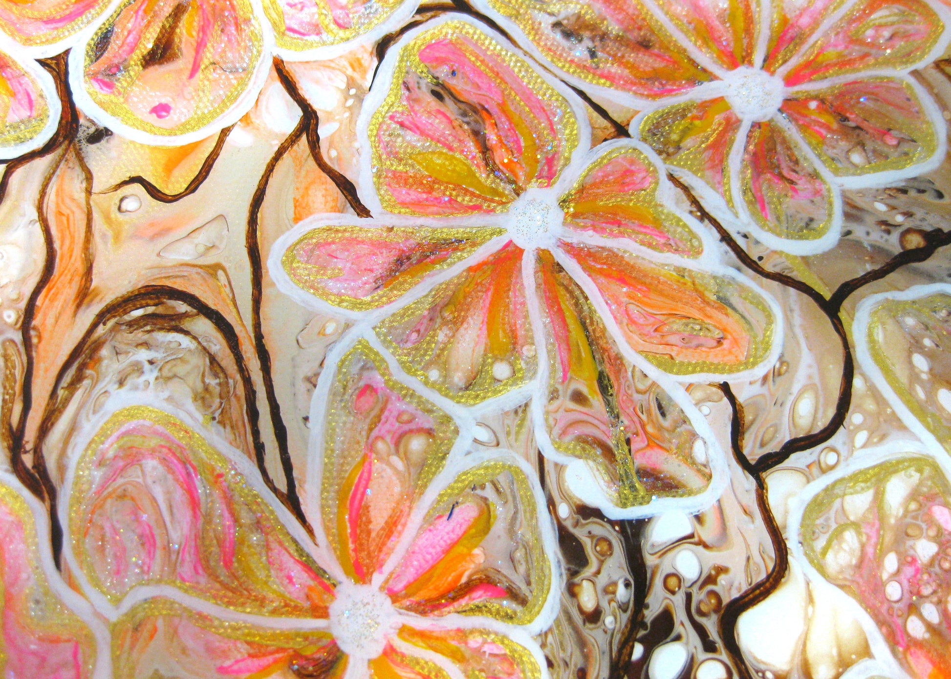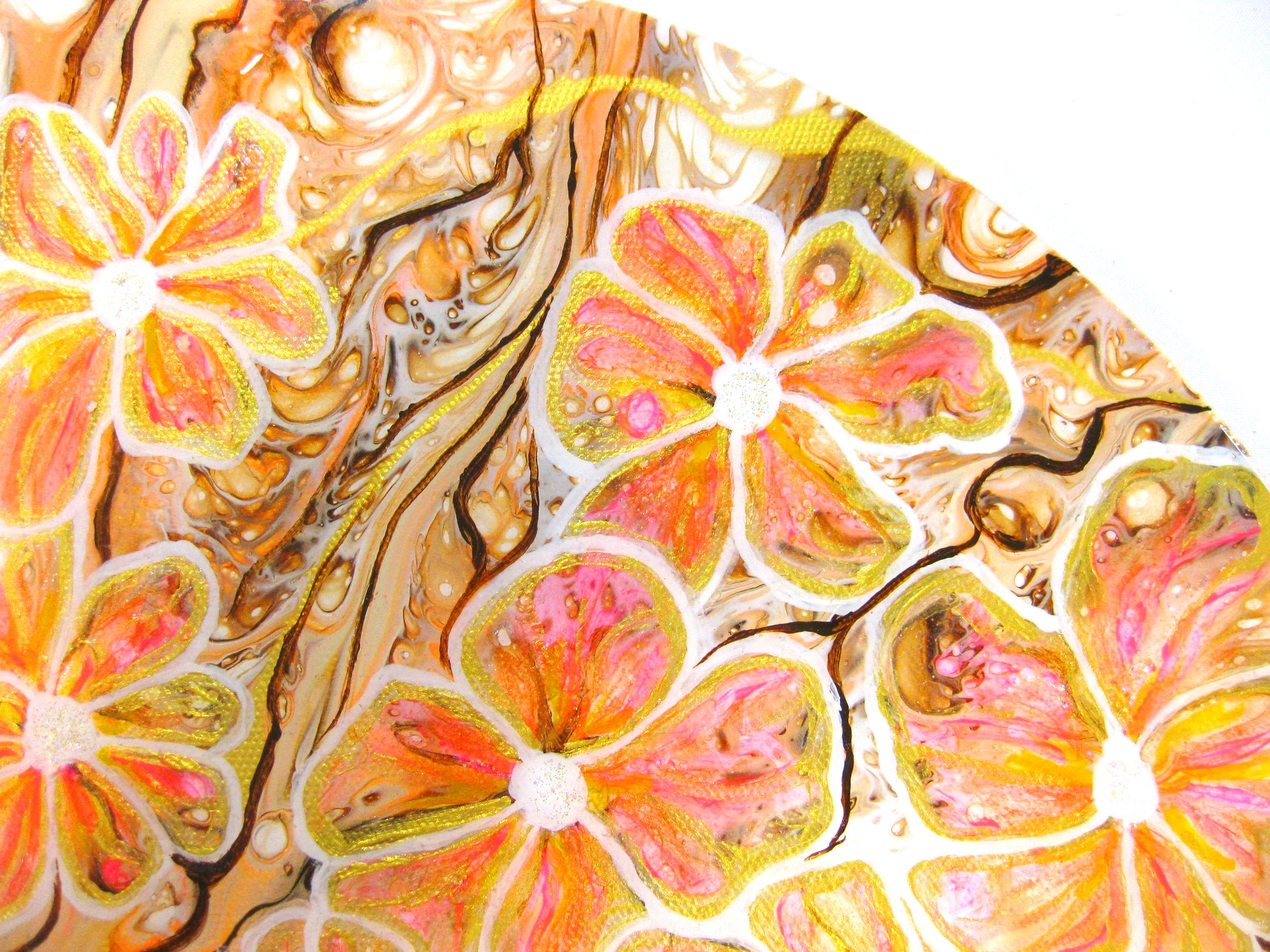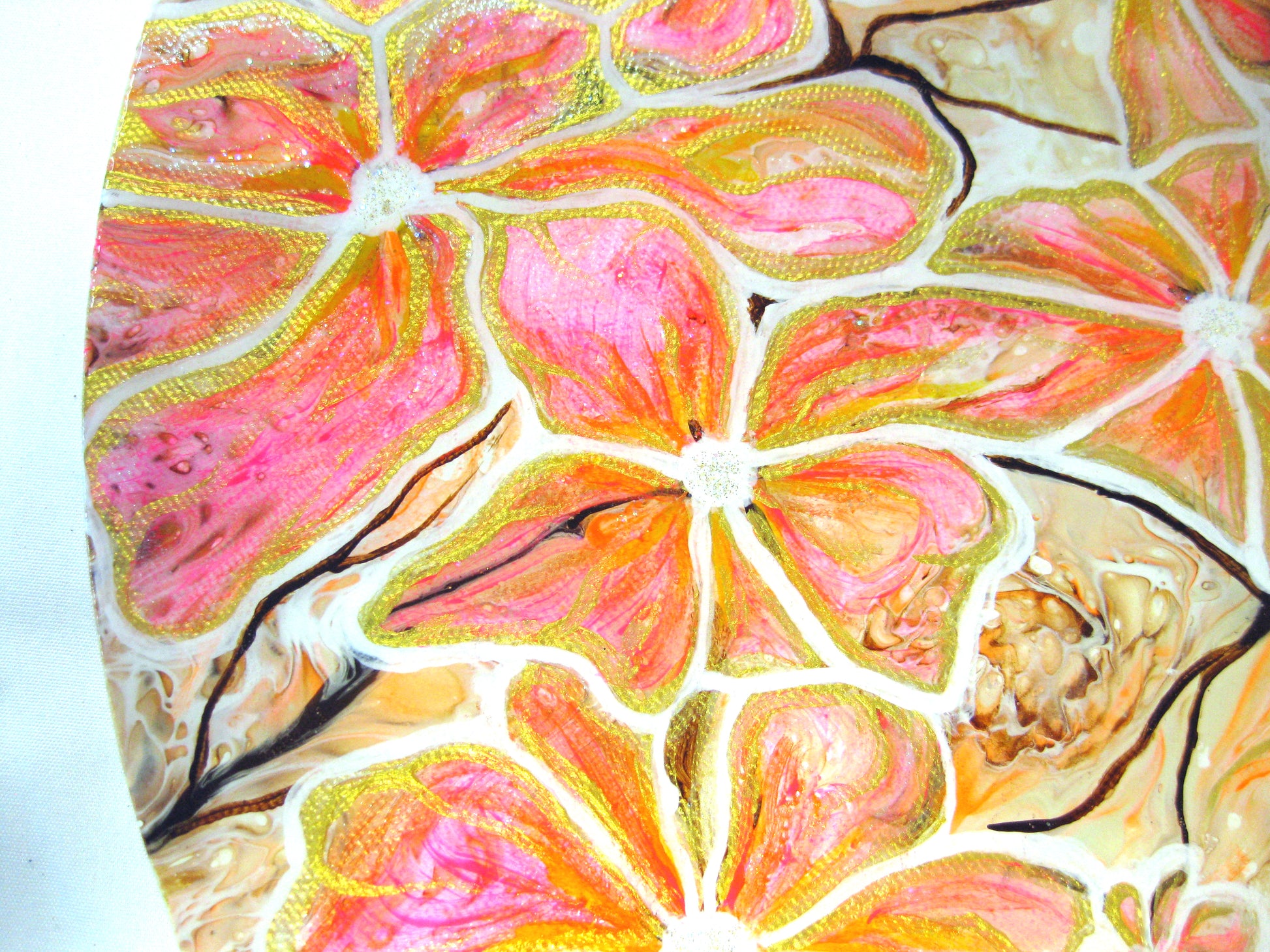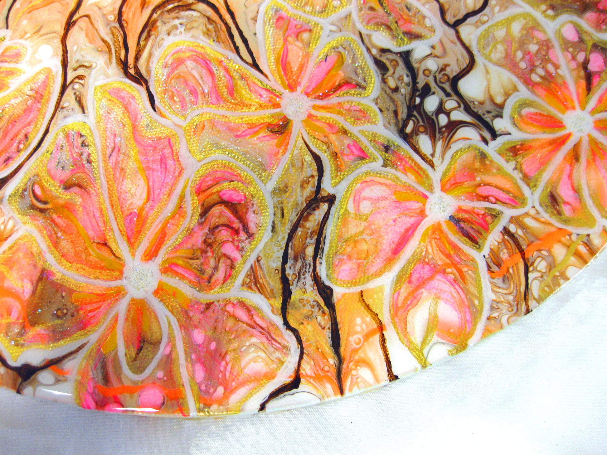 This unique creation was created on a white background using neon orange, neon pink, gold and burnt umber. I used various techniques including spin and balloon kisses, then hand painted to emphasize the flowers. Iridescent topcoat and gold glitter paint was then used to accent the piece. It was then sealed with resin to highlight the sparkling colors..