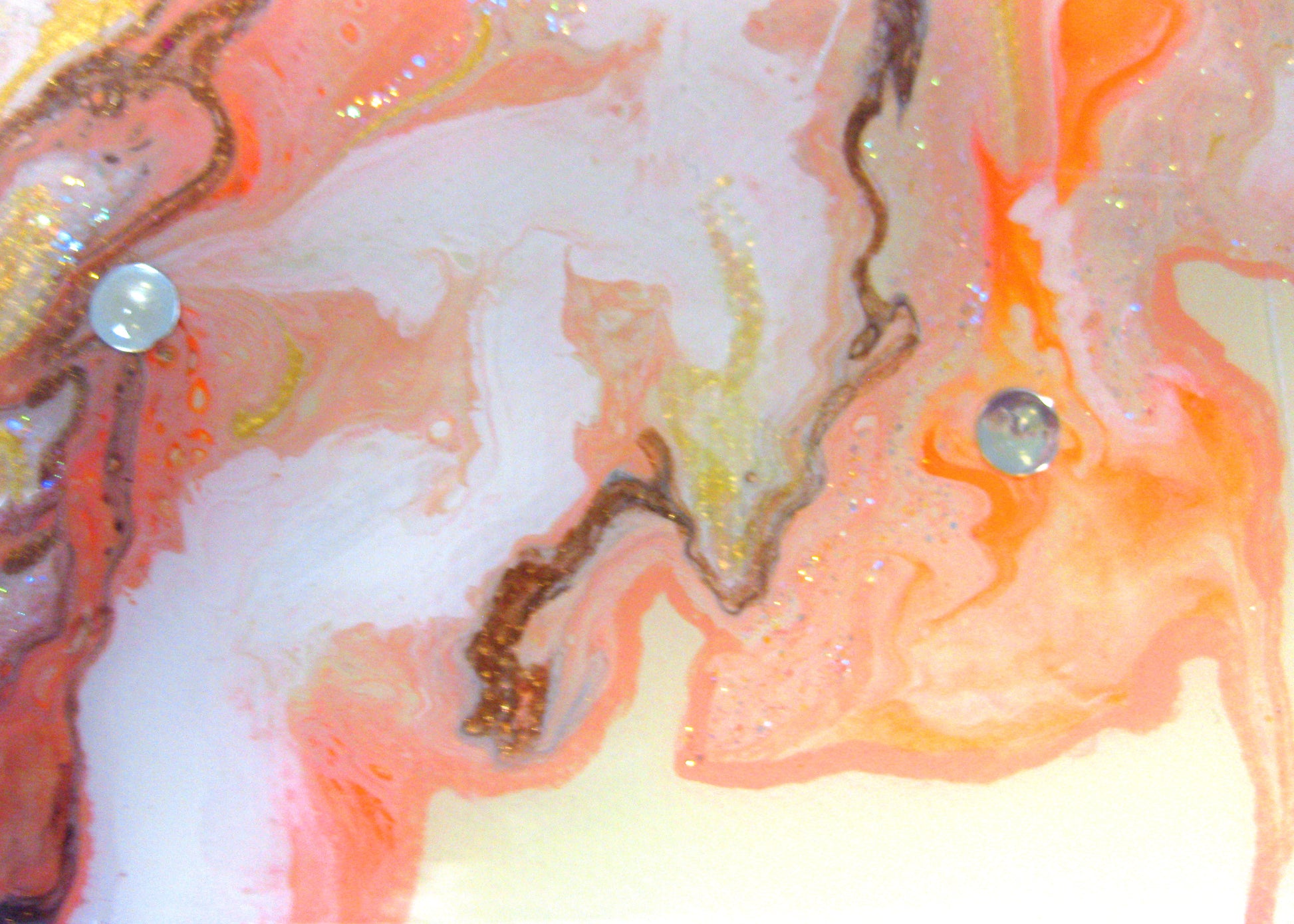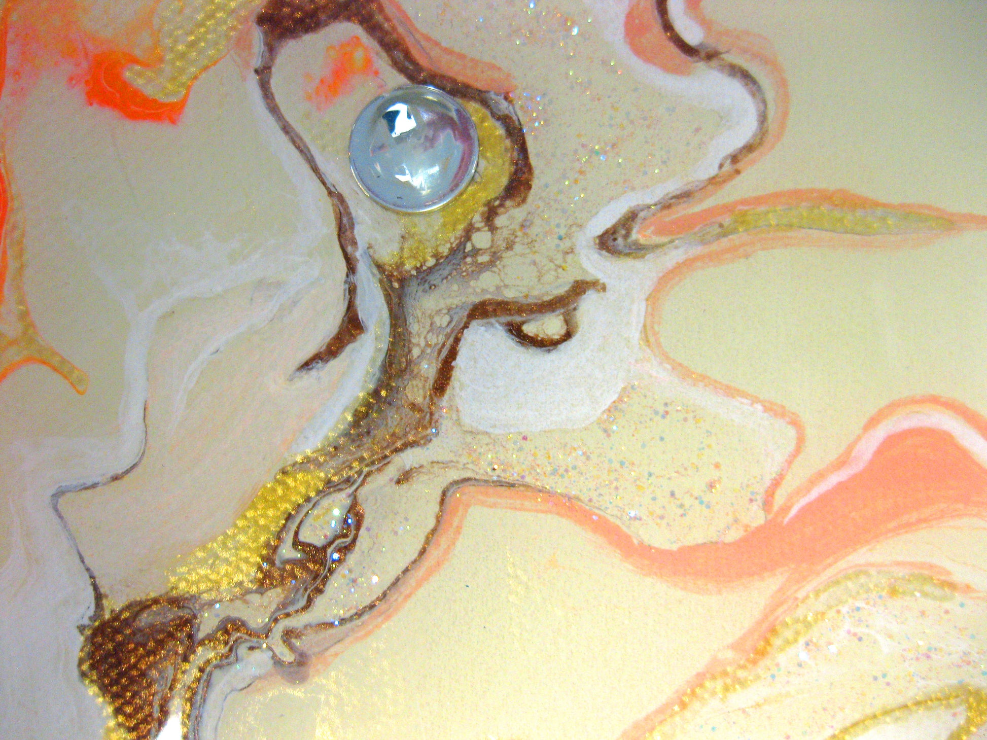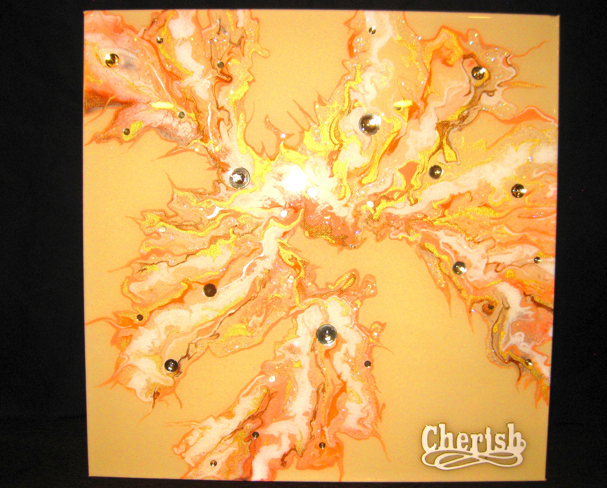 With this unique creation, I used a parchment (beige) background, I then added white, neon orange, peach, bronze and gold, using a blowout technique. It was then highlighted with gold gold rhinestones, tangerine fine glitter paint and a "Cherish" sign in wood. I then sealed it with resin to enhance its sparkle and shine.
