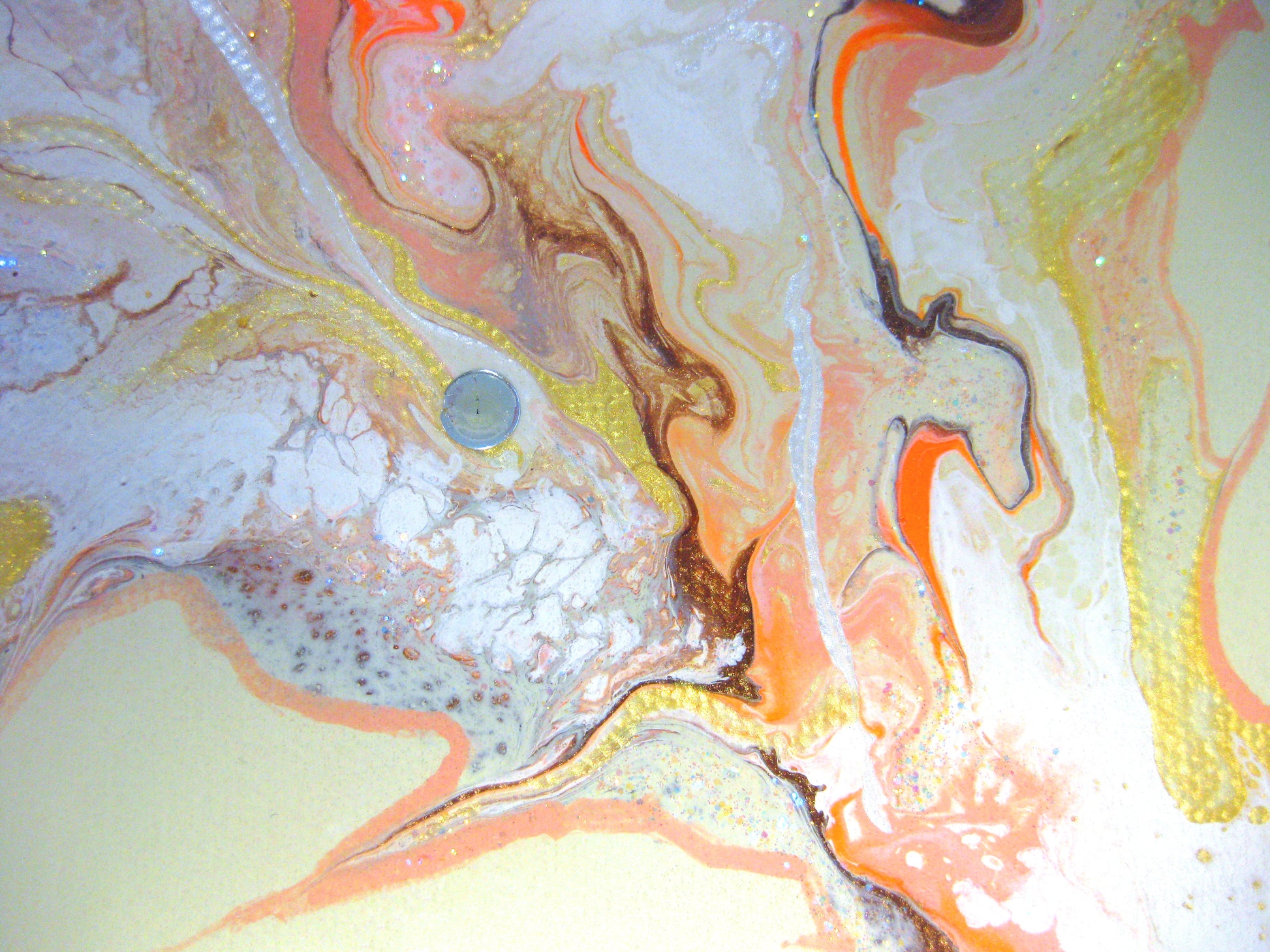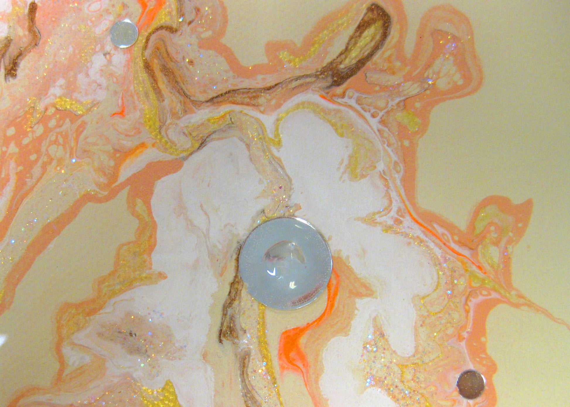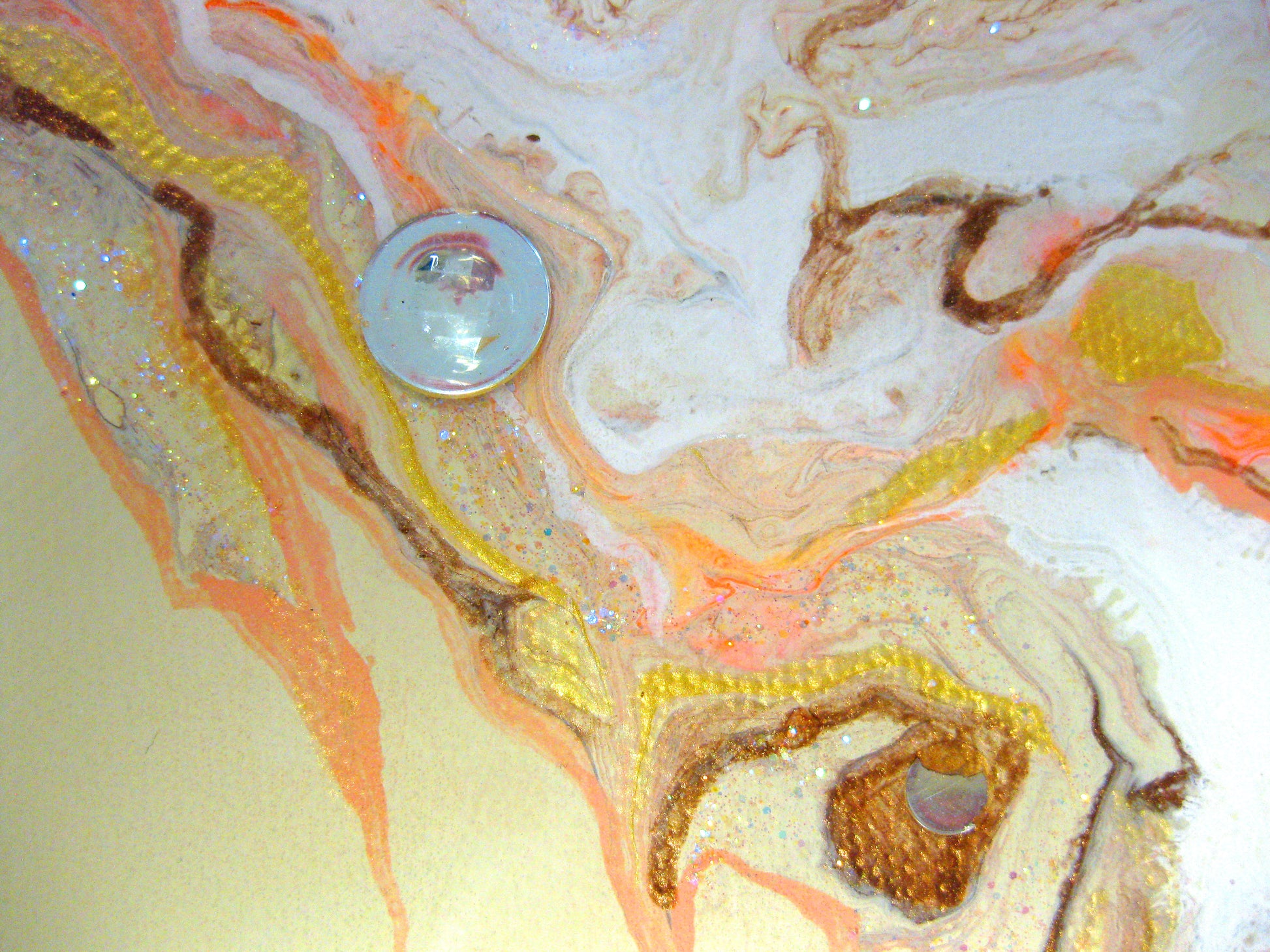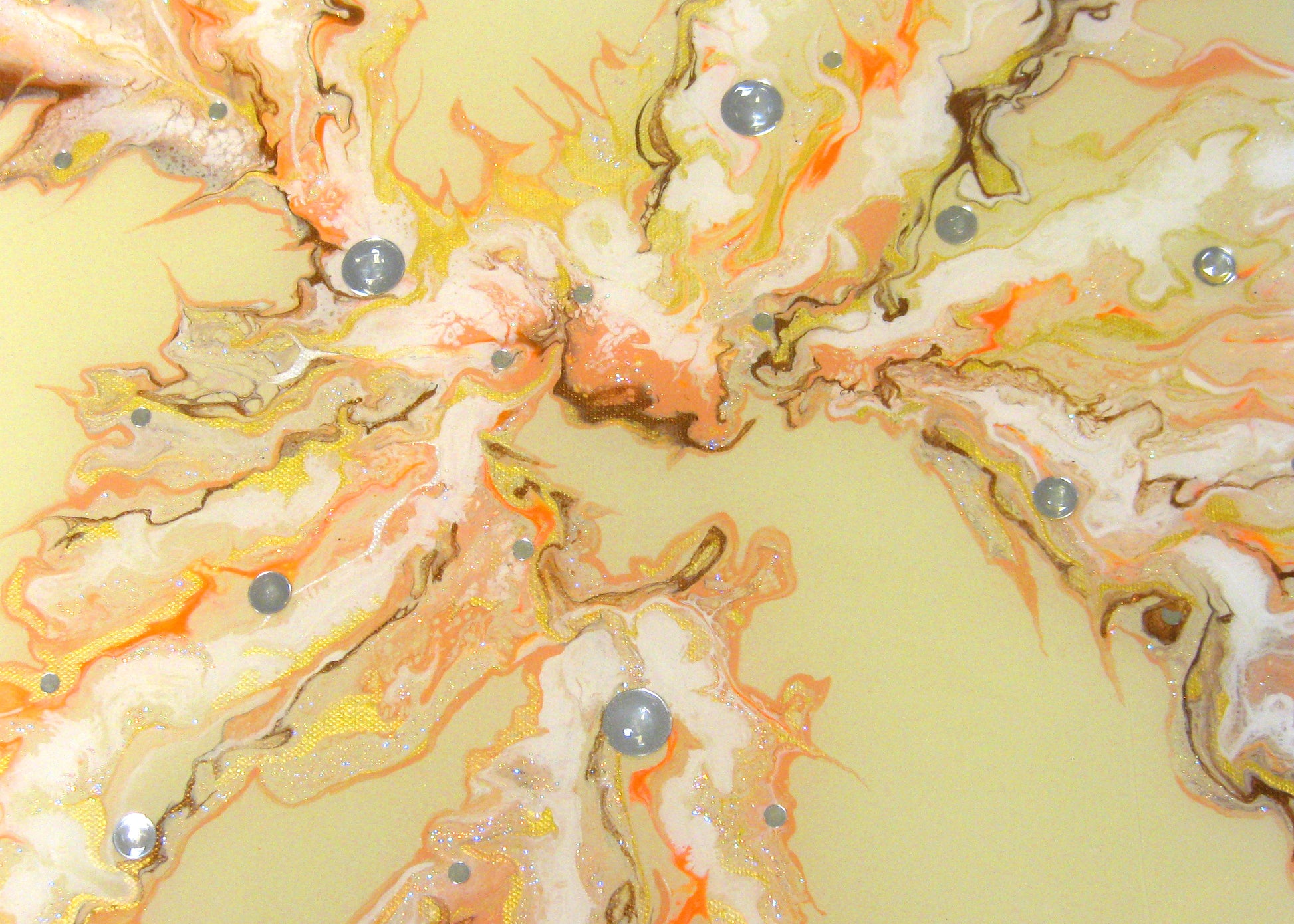 With this unique creation, I used a parchment (beige) background, I then added white, neon orange, peach, bronze and gold, using a blowout technique. It was then highlighted with gold gold rhinestones, tangerine fine glitter paint and a "Cherish" sign in wood. I then sealed it with resin to enhance its sparkle and shine.