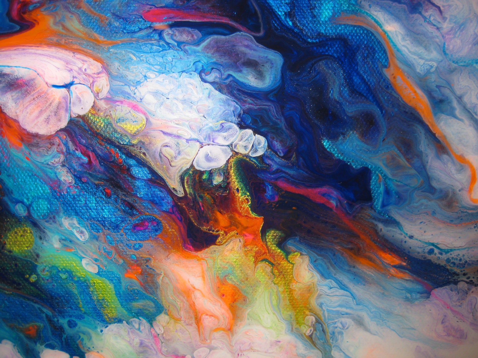This striking abstract is on a white background with an explosion neon colours of pink, orange,, purple and green, and other shades of iridescent blues and teals. I added all these colors to my canvas then covered them with......Saran Wrap! I then pulled up the corners and presto I saw this beautiful painting!! I then sealed it with resin to enhance the colors even more.