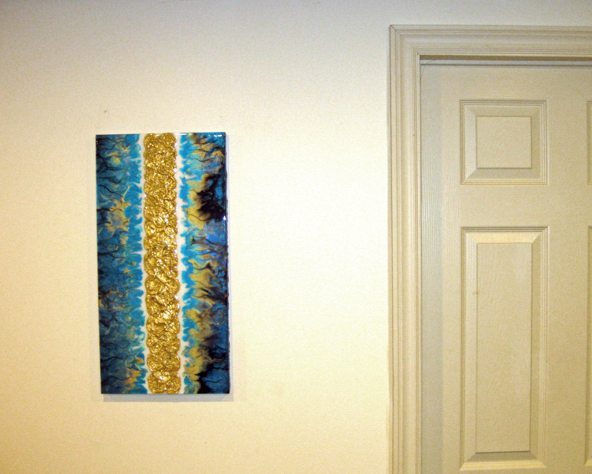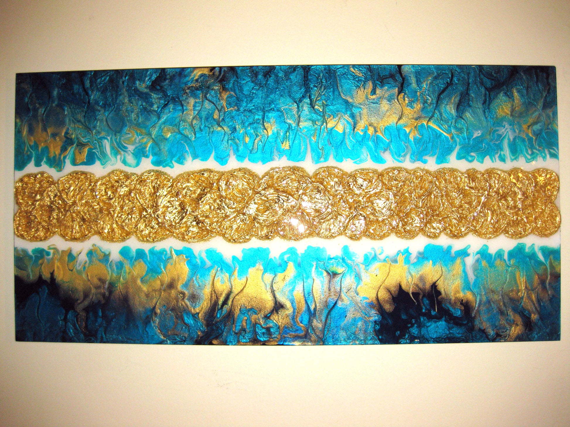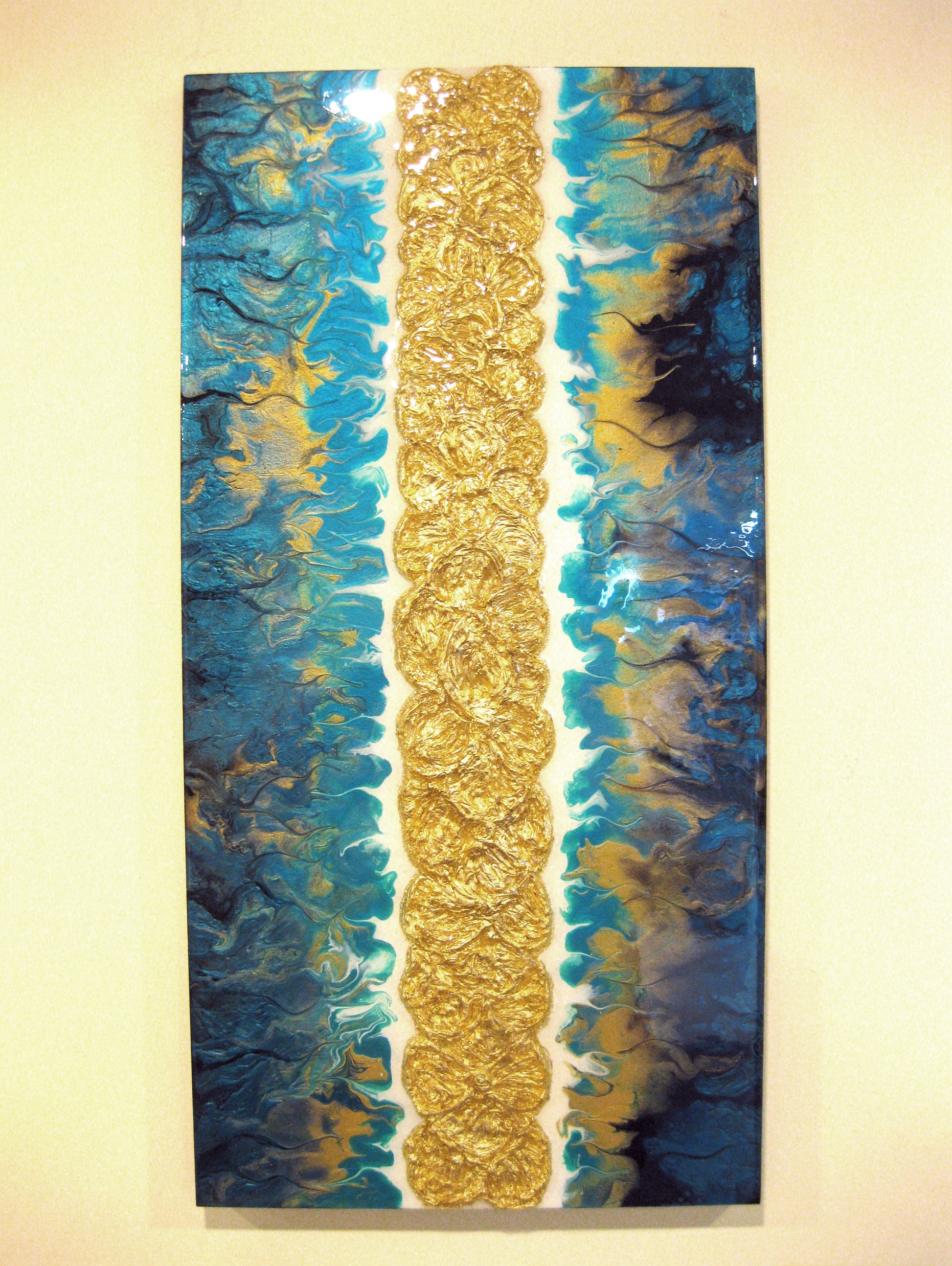 This vibrant painting was created by using modelling paste to create the abstract roses down the center of the wood panel. I then gold leafed it and added various shades of blues and greens, gold and white using a blowout technique away from the center. It was then sealed with resin to enhance the colors