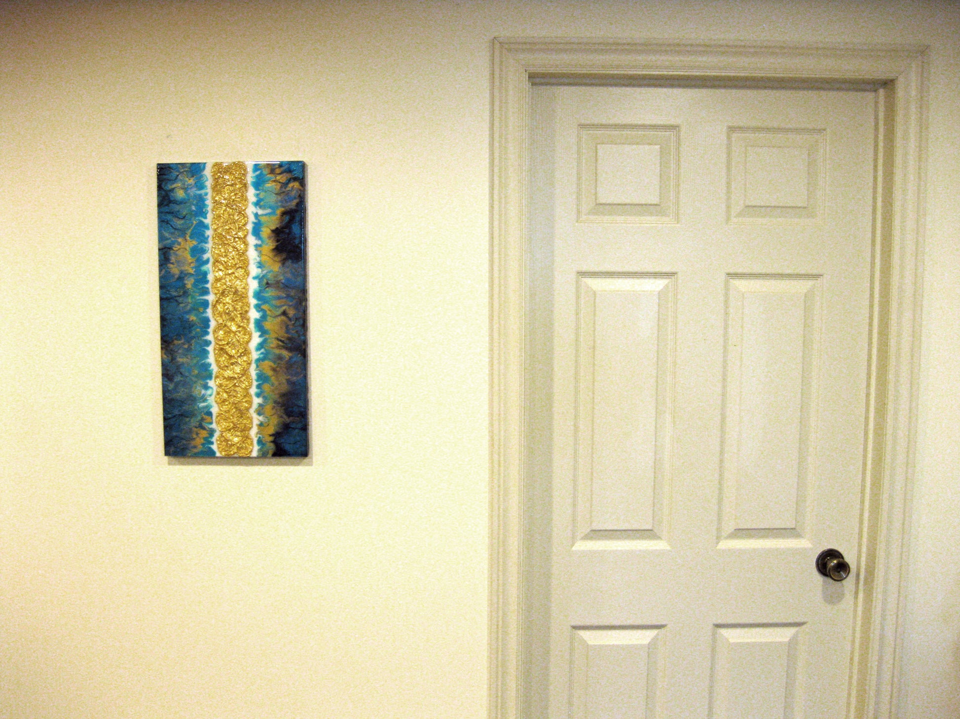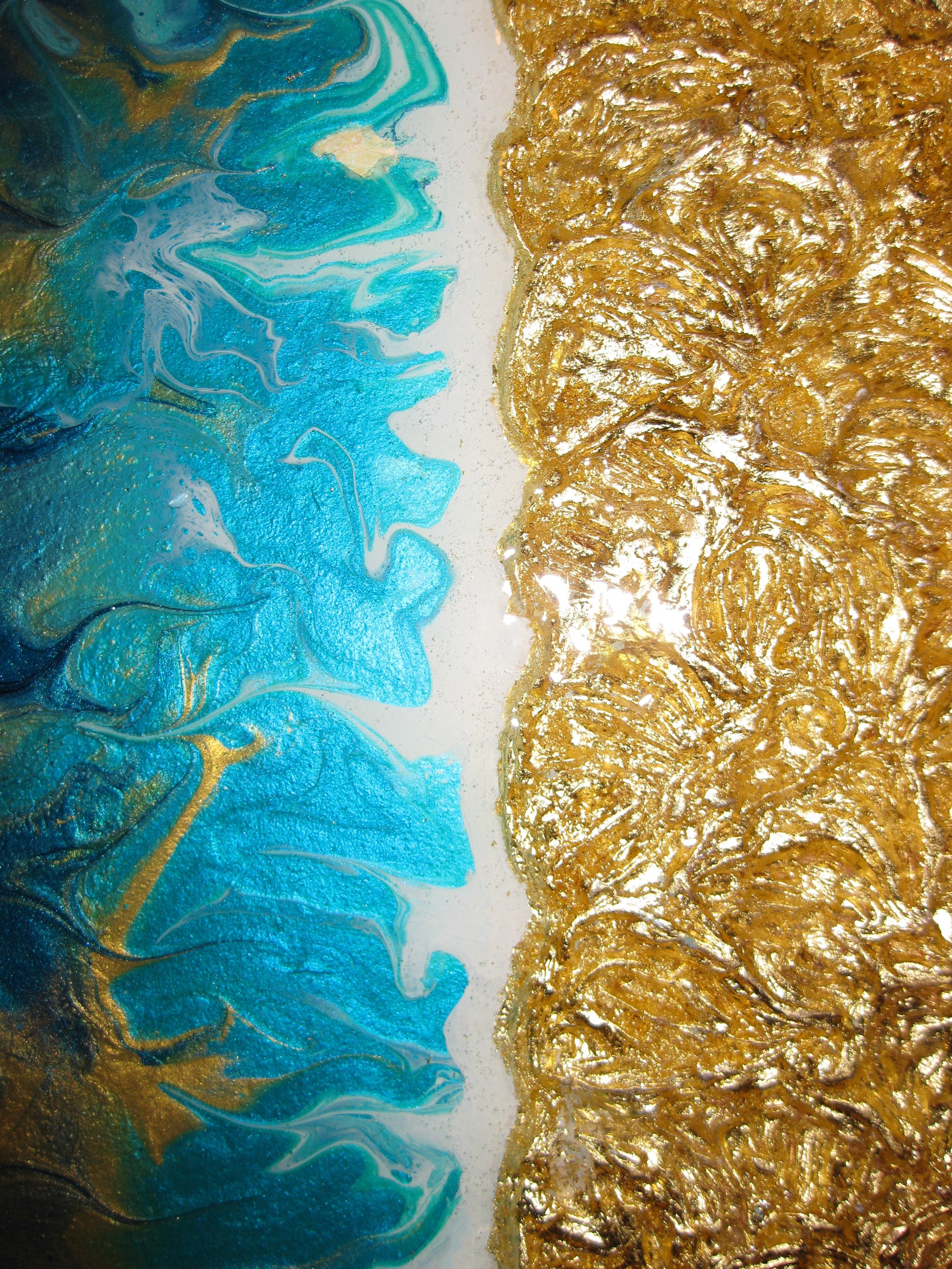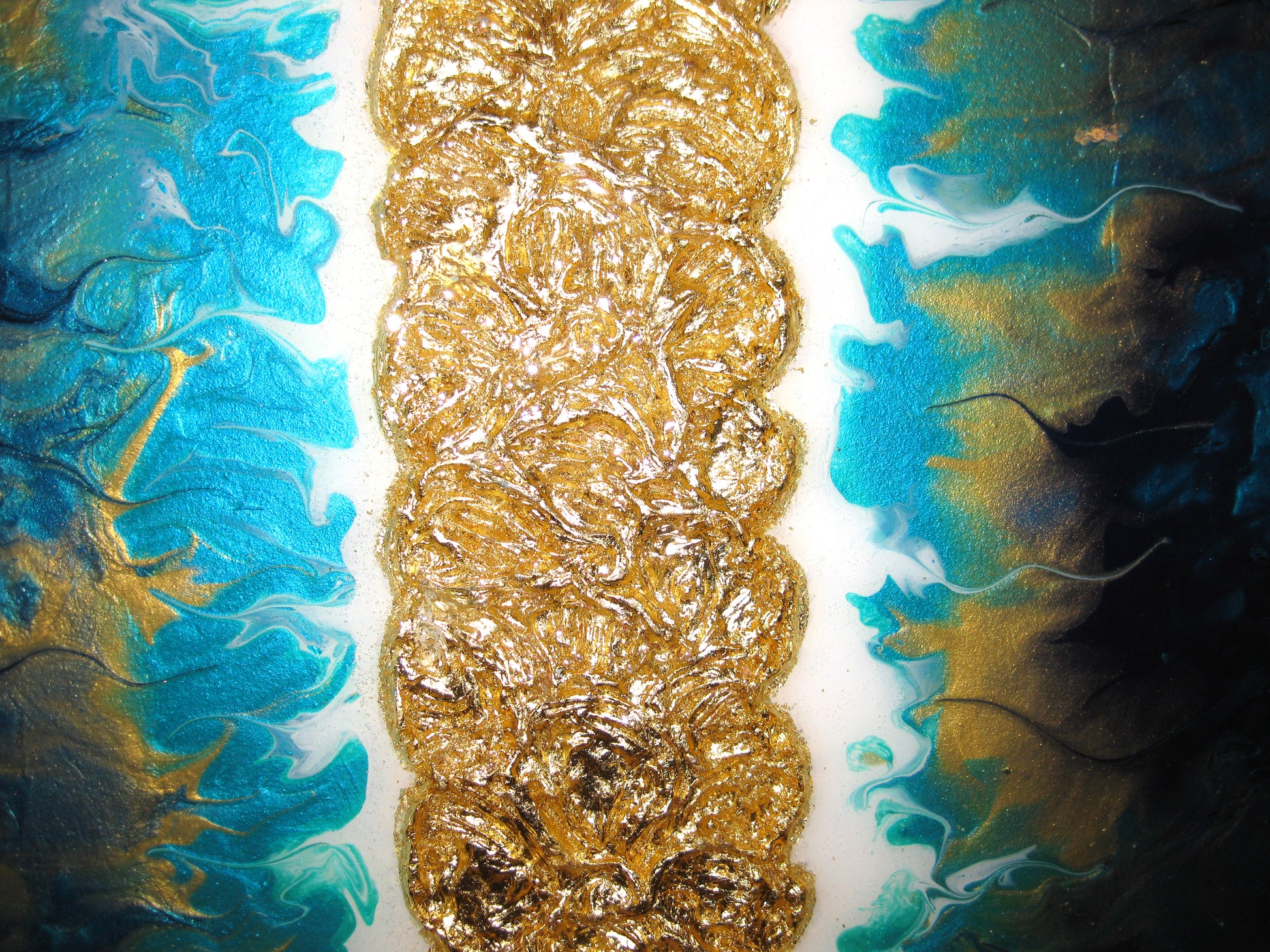 This vibrant painting was created by using modelling paste to create the abstract roses down the center of the wood panel. I then gold leafed it and added various shades of blues and greens, gold and white using a blowout technique away from the center. It was then sealed with resin to enhance the colors